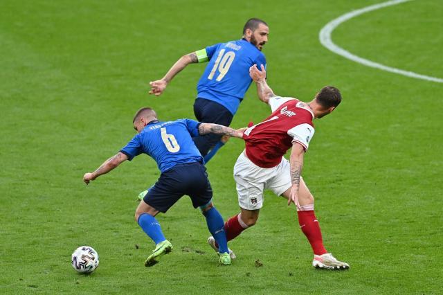 意大利距离崩盘只差一点点,明知道奥地利人的武器只有边路传中一条,但就是顶不住,1.80米的阿拉巴力压迪洛伦佐就是最好的例子。侥幸前国米球员阿瑙托维奇的头球被吹了越位。意大利的后卫还是得顶出来,虽然年事已高,但队长基耶利尼的缺席仍然是个损失。阿切尔比和迪洛伦佐的优势在于体力,两人都属于跑不死级别。所以我们看到阿切尔比即使躺在地上,仍将球拨给了插上的佩西纳,迪洛伦佐在加时的最后时刻,还能冲刺60米后攻门。